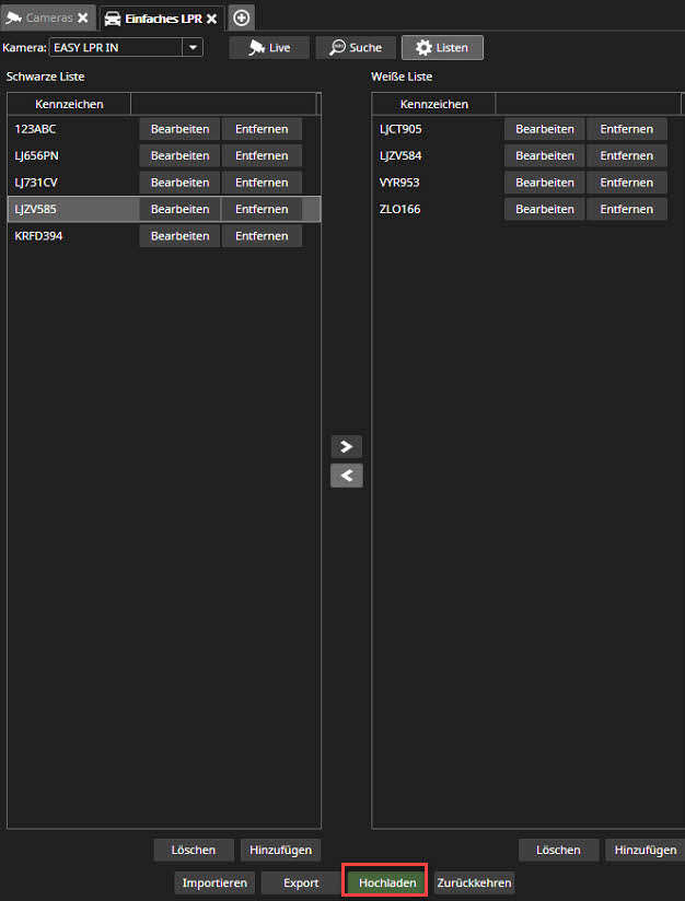 Mit dem Upload kann der Benutzer erstellte Black & White Lists auf die Kamera hochladen