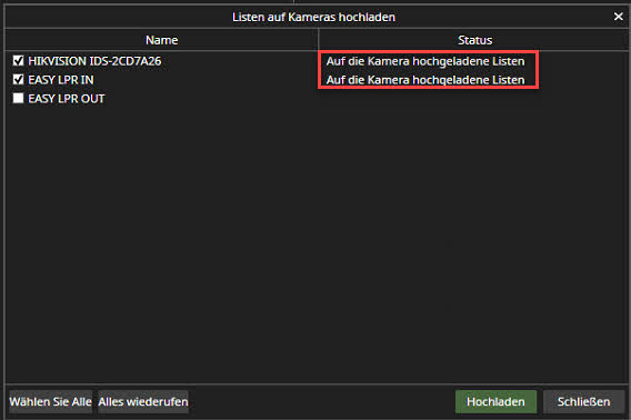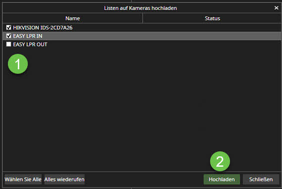 3. Kameras auswählen, bei denen Listen hochgeladen werden