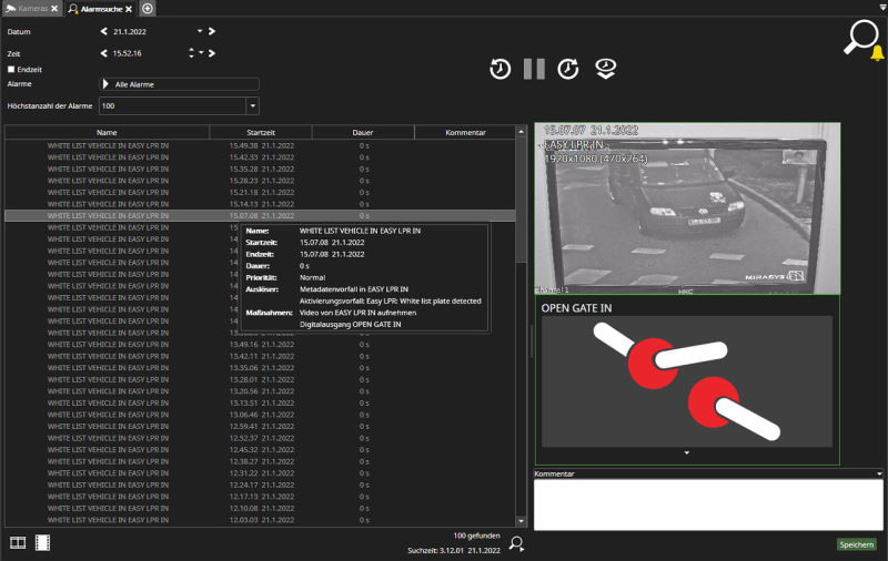 Durch Auswählen eines einzelnen Alarms werden detaillierte Informationen zum Alarm in einem Tooltip angezeigt.Wenn ein Alarm ausgewählt wird, werden die ihm zugeordneten Kameras und anderen Geräte im Alarmvorschaufeld rechts neben der Ergebnisliste angezeigt.Die Wiedergabesteuerung kann verwendet werden Ergebnisse überprüfen. Jeder Klick aktualisiert den Inhalt auf der rechten Seite.Der Tooltip zeigt Name, Startzeit, Endzeit, Dauer, Priorität, Auslöser, Aktion und Alarmbeschreibung und Alarmbestätigungen, wenn diese auf Alarm eingestellt sind, und den Kommentar.Doppelklick auf eine Alarm in der Liste auftritt, öffnet den Alarm in der Registerkarte Alarmansicht.