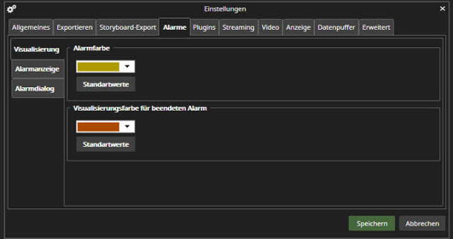 Die Alarmvisualisierung ermöglicht eine Auswahl der Alarmhervorhebungsfarbe für aktive und beendete Alarme.