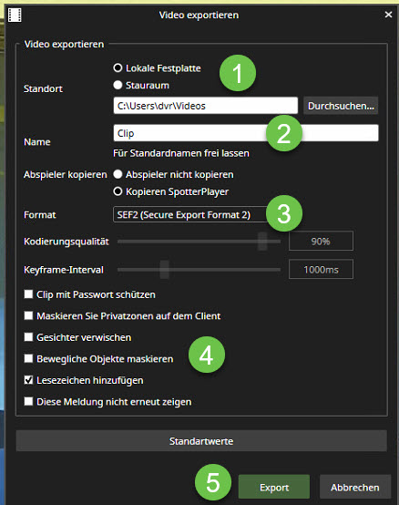 Das schnellste Exportdateiformat ist SEF (Secure Export Format). Es kann mit Spotter oder SpotterPlayer. angesehen werden
