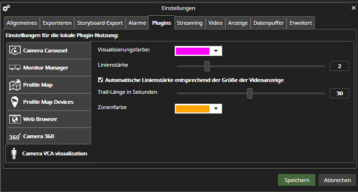 Mit den VCA-Visualisierungseinstellungen kann der Benutzer die Farbe der VCA-Hervorhebung und der Bewegungsspur, die Länge der Bewegungsspur in Sekunden und die Linienstärke ändern.