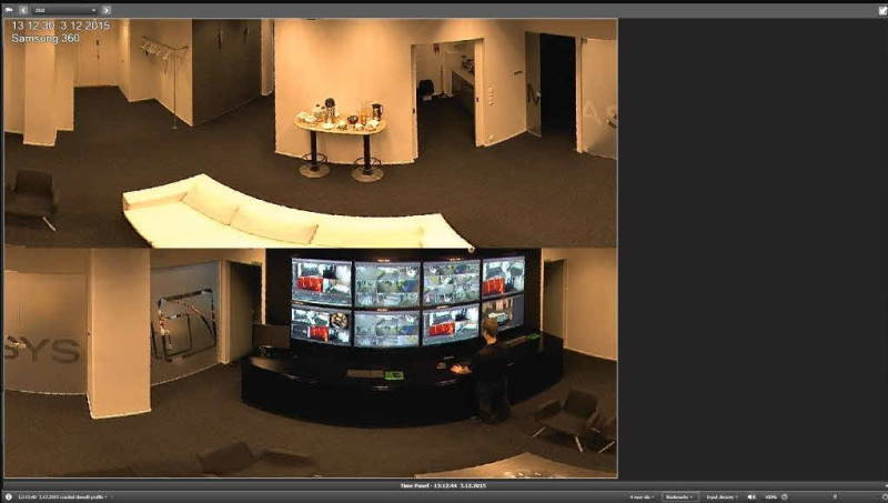 Wenn 360°-Entzerrung verwendet wird, ist es möglich, oben auf das Bild zu klicken und dann die Maus zu bewegen und das Mausrad zum Zoomen zu verwenden.Dies fungiert als ultraschnelles virtuelles PTZ. Beim erneuten Klicken mit der Maus wird die Steuerung freigegeben und die Änderungen gespeichert.Der De-Warp-Modus schaltet automatisch auf eine Einzelansicht um, wenn die Kamera angeklickt wird.  Beispielansicht einer entzerrten Panoramakamera: