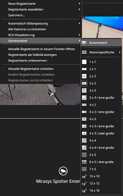 Der Standardansichtsmodus des Arbeitsbereichs ist automatisch.Kameras erscheinen in diesem Modus alle in derselben Größe, und die Position und Größe ändern sich automatisch, wenn weitere Kameras hinzugefügt werden. Es sind auch feste Raster verfügbar, bei denen einige Kameras wichtiger sein können andere, und Kameras halten sich an das Gitter des festen Ansichtsmodus und bewegen sich nicht wie im automatischen Modus.Die festen Gitter sind über das Registerkartenmenü verfügbar.