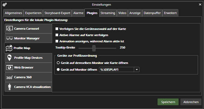 Der Gerätebaum hat auch eine „Auf Karte anzeigen“-Option für jedes Gerät im Rechtsklickmenü.Das Profilkarten-Plugin kann auf einen Alarm reagieren, indem es die Ansicht umschaltet, um die Kartenansicht anzuzeigen, wo ein Auslöser für den Alarm war. Diese Einstellung wird über die Profilkarteneinstellungen gesteuert.