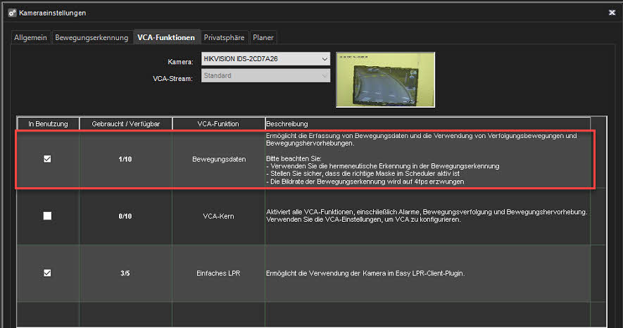 Bevor Bewegungsverfolgung im gesamten Bildbereich verwendet werden kann, muss die VCA-Funktion Bewegungsdaten auf der Registerkarte VCA-Funktionen aktiviert werden.