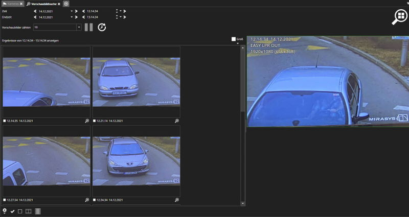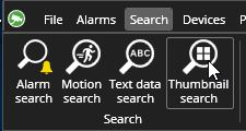 A Die Thumbnail-Suche bietet dem Benutzer eine schnelle Möglichkeit, Kameramaterial visuell zu überprüfen.Sie ist hauptsächlich für Szenarien gedacht, in denen eine visuelle Änderung in der Kameraansicht bemerkt werden kann und der Benutzer schnell den Zeitpunkt finden möchte, zu dem diese Änderung aufgetreten ist.Wenn die Die Thumbnail-Suche wird gestartet, sie ruft Thumbnails aus gespeicherten Videos ab und zeigt sie in der Ergebnisansicht an.