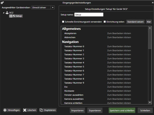 Wenn das Zeilenelement „Setup“ nicht sichtbar ist, fügen Sie es mit der Schaltfläche „+ Hinzufügen“ hinzu.Jetzt können Sie die Joystick-Tasten und die Bewegungsachse konfigurieren und sie Spotter-Aktionen zuordnen.Jede Tastenkombination kann verwendet werden, sodass mehrere Tastendrücke möglich sind verwendet werden, um im Vergleich zu einzelnen Tastendrücken andere Dinge zu tun.