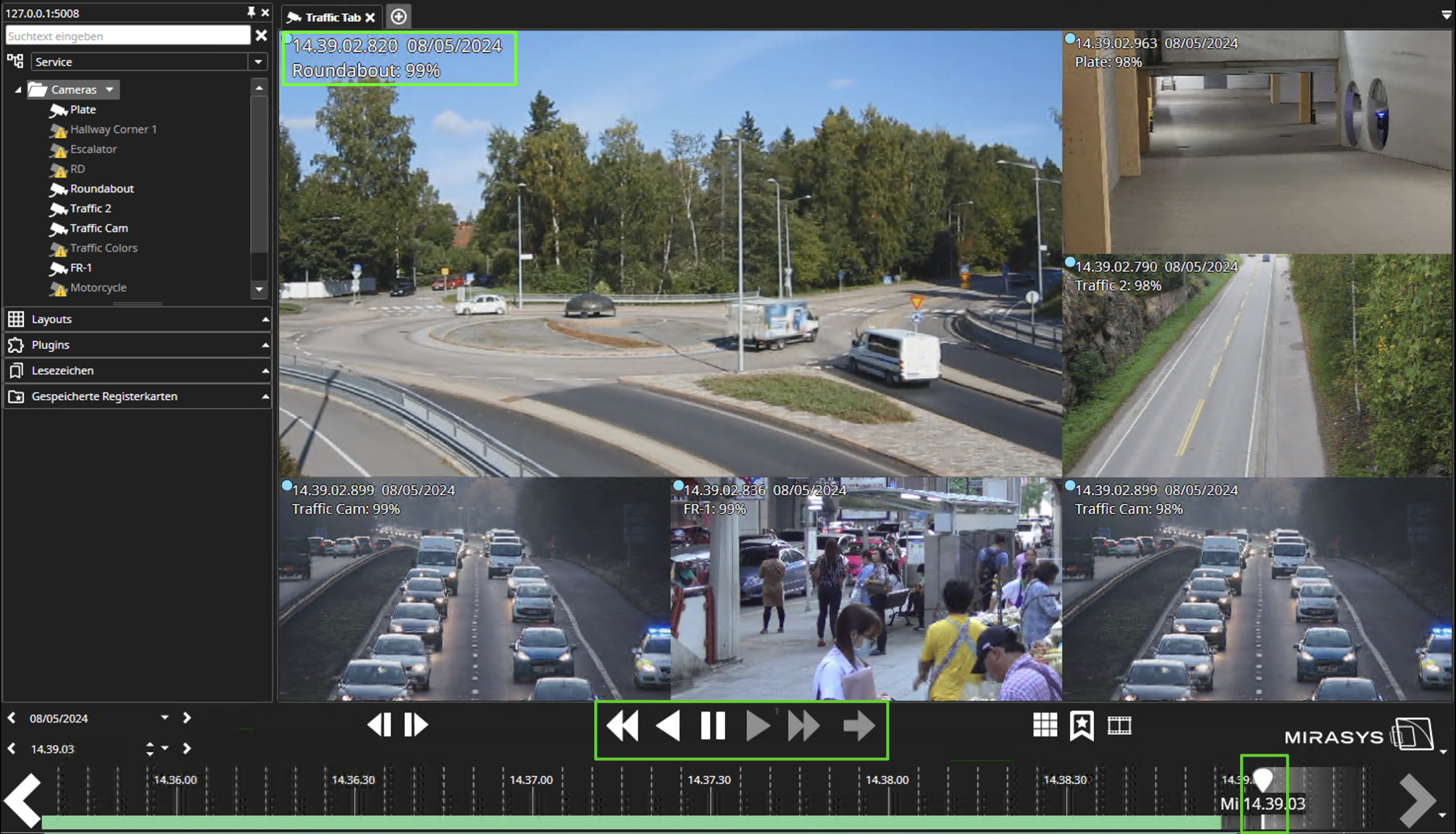 Der Echtzeitmodus wird angezeigt, wenn die Wiedergabesteuerungen weiß und groß sind und die Zeitleiste weiß ist. Bei ausgewählten Kameras wird die aktuelle Zeit in der oberen linken Ecke des Streams angezeigt.