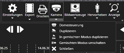 Wenn einige Kameras auf diese Weise hervorgehoben sind, befinden sie sich im gemischten Wiedergabemodus.Andere nicht ausgewählte Kameras sind immer in Echtzeit.Die Kameras in der gemischten Wiedergabe können jetzt mit dem Zeitschieberegler, den Wiedergabesteuerungen oder gesteuert werden ein Joystick Jog-Wheel.