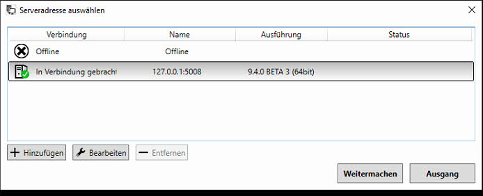 Die Site-Auswahlliste enthält die Liste aller konfigurierten Master-Server.Weitere Server können hinzugefügt oder die Details bestehender Server mit den Hinzufügen- und Bearbeiten-Optionen bearbeitet werden.Benutzer können einen Server auswählen und auf „Weiter“ klicken, um sich anzumelden dieser Server.