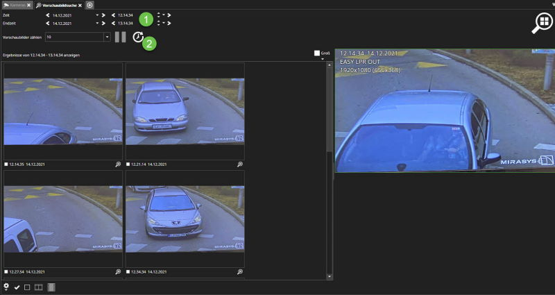 A Die Thumbnail-Suche bietet dem Benutzer eine schnelle Möglichkeit, Kameramaterial visuell zu überprüfen.Sie ist hauptsächlich für Szenarien gedacht, in denen eine visuelle Änderung in der Kameraansicht bemerkt werden kann und der Benutzer schnell den Zeitpunkt finden möchte, zu dem diese Änderung aufgetreten ist.Wenn die Die Thumbnail-Suche wird gestartet, sie ruft Thumbnails aus gespeicherten Videos ab und zeigt sie in der Ergebnisansicht an.