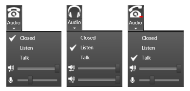 Nykyisen käyttäjän äänikanava ei ole auki.Puhetilassa käyttäjä kuulee äänen kamerasta, ja nykyisen käyttäjän äänikanava on auki, joten ääni lähetetään kameraan.Työkalurivin kuvakkeessa on punaiset (kameraan) ja vihreät (kamerasta) äänenvoimakkuuden ilmaisimet, jotka osoittavat, tuleeko ääntä kameraan vai tuleeko kamerasta.Kanavien äänenvoimakkuutta voidaan säätää liukusäätimistä.