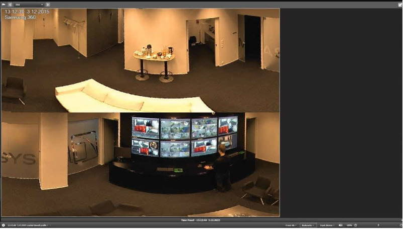 Kun 360-kuvan suoristaminen on käytössä, on mahdollista napsauttaa kuvan yläosaa ja liikuttaa sitten hiirtä ja käyttää hiiren rullaa zoomaukseen.Tämä toimii erittäin nopeana virtuaalisena PTZ:nä. Kun napsautat uudelleen hiirellä, säädin vapautetaan ja muutokset tallennetaan.Kierteenpoistotila siirtyy automaattisesti yhteen näkymään, kun kameraa napsautetaan. Esimerkki panoraama-kuvasta