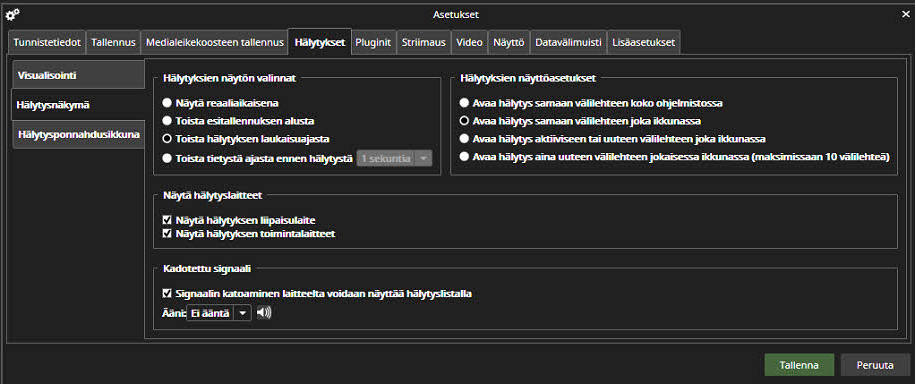 Hälytyksien näytön -valinta määrittää, milloin hälytys aloitetaan toistamaan, kun se avataan hälytysluettelosta. Vaihtoehdot ovat: