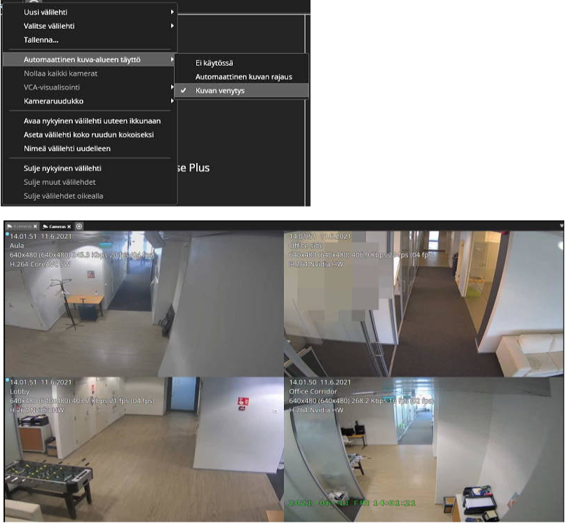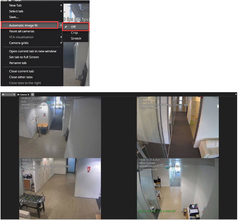 Tämä toimii parhaiten automaattisessa katselutilassa, jos näytöllä on 4 tai 9 kameraa.Staattisessa ruudukkotilassa automaattinen rajaus saa kamerat sopimaan kiinteän ruudukon solun kuvasuhteeseen.Tämä vaihtoehto on käytettävissä vain kiinteissä tai mukautetuissa ruudukoissa.