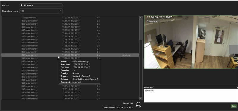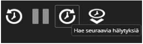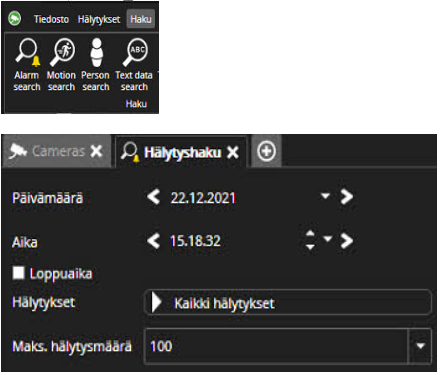 Kun haku on käynnissä, taukopainike haun taaksepäin ja eteenpäin välillä aktivoituu, ja käyttäjä voi keskeyttää tai keskeyttää haun. Kun hälytyksen hakuaika- ja päivämäärähaut on muutettu, viimeksi löydetystä kohteesta tulee uusi aika. Näin, käyttäjä voi toistaa tarkan haun tarvittaessa edelleen. Hälytystulokset näkyvät luettelossa, jossa näkyy hälytyksen nimi, hälytyksen alkamisaika, kesto ja kommentti. Käyttäjä voi lajitella luettelon napsauttamalla otsikkokenttiä.