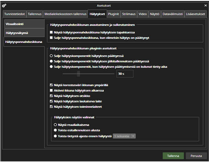 Jos käyttäjä haluaa, että Hälytys-ponnahdusikkuna ei avaudu normaalisti ja avautuu vain hälytyksen sattuessa, hänen tulee valita ensimmäinen valintaruutu.