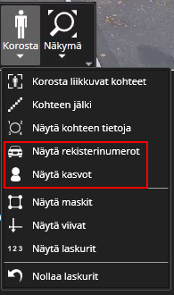 Rekistikilpien ja kasvojen visualisoinnille (reunusten piirtäminen sekä nimi/rekisterinumero) on kaksi "Korostus"-valikkokohtaa: