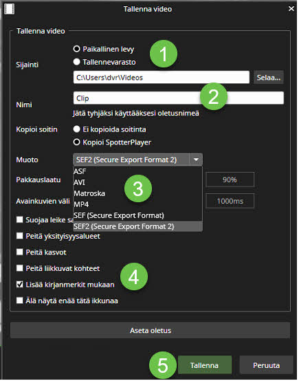 Nopein vientitiedostomuoto on SEF (Secure Export Format). Sitä voi katsella Spotter:llä tai SpotterPlayer.:llä