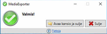 Kun MediaExporter on viimeistellyt videon viennin, käyttäjä pääsee sijaintikansioon napsauttamalla Avaa kansio ja sulje