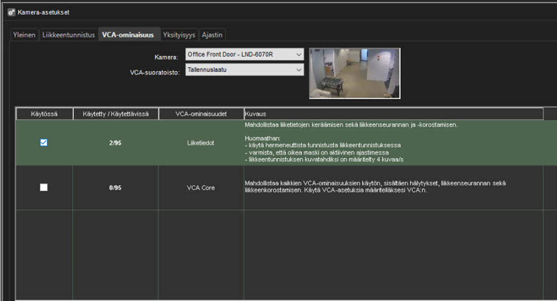 Ennen kuin Liikkeenseuranta koko kuva-alueella voidaan käyttää, VCA-ominaisuus Liiketiedot on otettava käyttöön VCA-ominaisuudet -välilehdeltä.