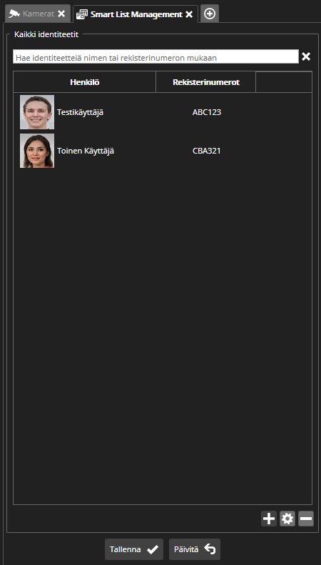 Identiteettilistojen yläpuolella on Haku kentät: kun kirjoitat hakukenttään, identiteettilista päivittyy automaattisesti näyttämään ne identiteetit joiden nimestä tai rekisterinumerosta löytyi hakuteksti.