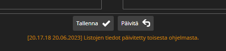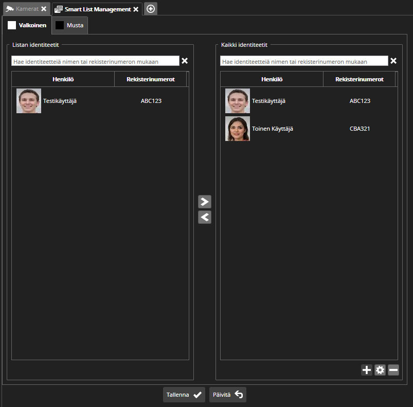 Dialogin aloosassa on kaksi nappulaa: Tallenna ja Päivitä. Klikkaamalla Päivitä nappulaa data ladataan list management palvelulta. Tässä tapauksessa palvelulta haettu data (identiteetit ja listat) korvaa aikaisemman datan, ja tehtyjä muutoksia ei tallenneta. Klikkaa Tallenna nappulaa tallentaaksesi muutokset list management palvelulle.