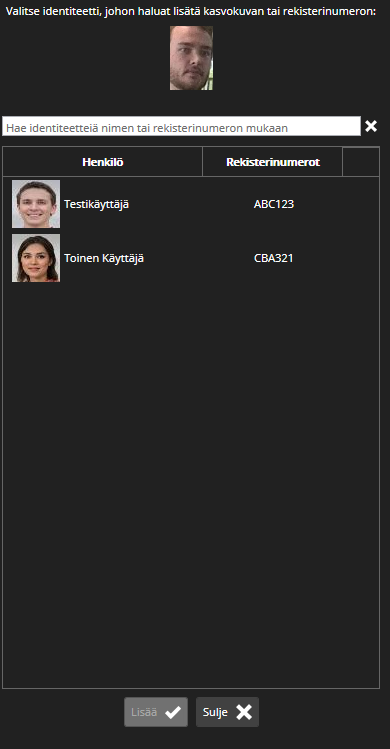 Kasvojen tai rekisterinumeron lisääminen on mahdollista vain jos käyttäjällä on oikeus muokata identiteetin tietoja.