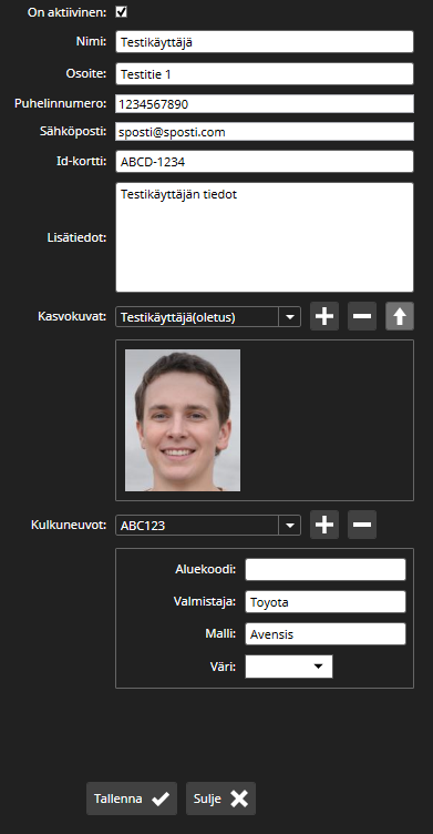Tässä voidaan täyttää identiteetin tiedot, lisätä ja poistaa kasvokuvia ja ajoneuvoja.