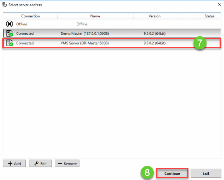 8. Luo yhteys valittuun VMS-palvelimeen napsauttamalla Jatka