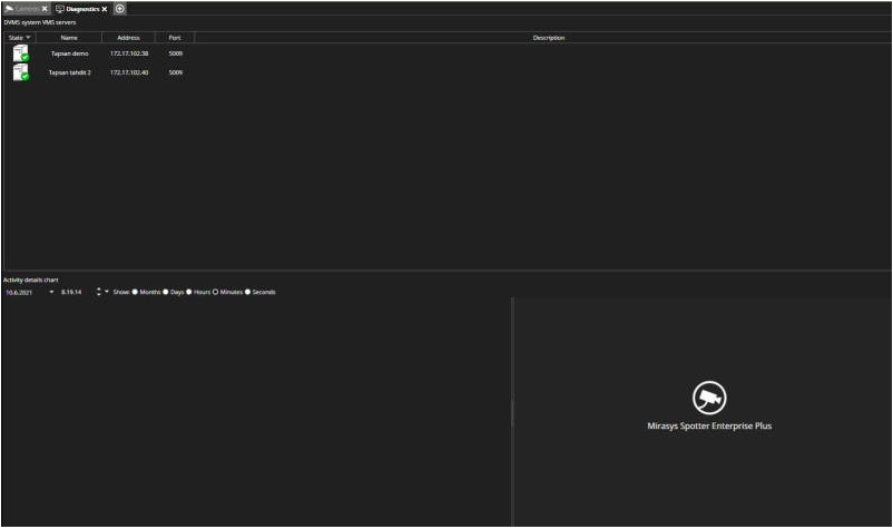 Diagnostiikka näyttää pääpalvelimeen yhdistettyjen VMS-palvelimien nimen, IP-osoitteen ja tilan