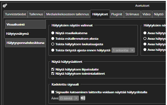 Asetus tallennetaan asetteluihin.Vaikka hälytyslista on piilotettu, jos "näytä"-suodatin on määritetty näyttämään signaalin kadonnut tapahtuma, äänitiedosto toistetaan, kun tapahtuma tapahtuu.Jos hälytysluettelo on määritetty näyttämään signaali kadonnut hälytyksenä, se näkyy kadonneen kuvakkeen kanssa.
