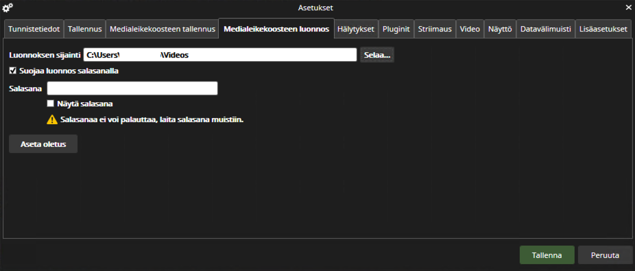 Käytä aina luonnoksen tallennusajankohdan mukaista salasanaa, sillä salasanan muutokset vaikuttavat tuleviin luonnoksiin, mutta eivät aiemmin tallennettuihin luonnoksiin.