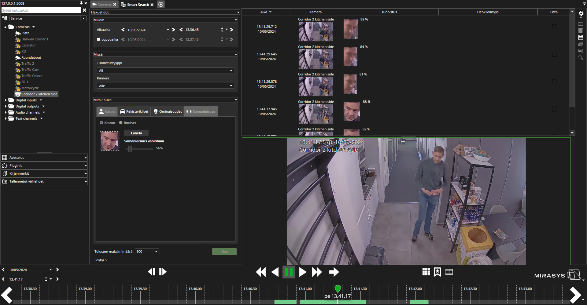 Näytä hakutulokset, joissa näkyvät aika, kamera, tunnistus, tunniste ja käytetty luettelo.