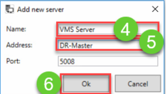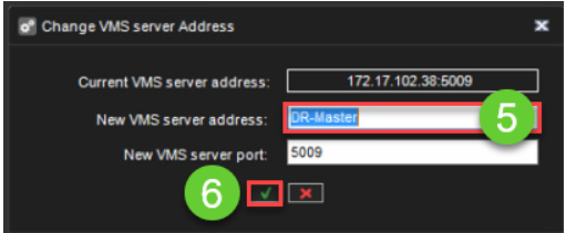 5. Kirjoita VMS-palvelimen tietokoneen nimi (DNS-nimi) Uusi VMS-palvelimen osoite -kenttään