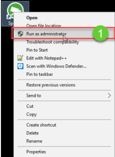Valitse Spotter-kuvaketta hiiren kakkospainikkeella ja valitse Suorita järjestelmänvalvojana