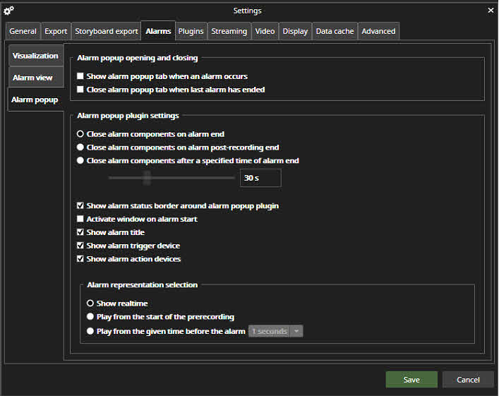 Alarm popup settings define how the Alarm popup view opens and closes.