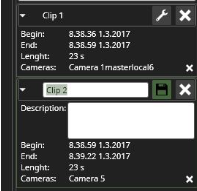 The clip is still in edit mode (white text boxes and the "Save" icon). The clip name or description can be edited. Any change in the clip start or end times or camera content is still reflected in the clip contents.
