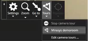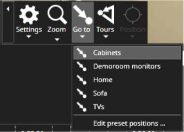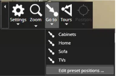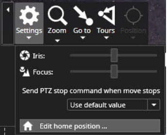 The PTZ settings menu contains iris and focuses slider controls and editing the camera home position.The home position can be selected from the currently saved presets or tours.It is also possible to define how long the camera takes until it returns to the home position and if the switch to the home position is made only if it is not in some other tour or preset position.