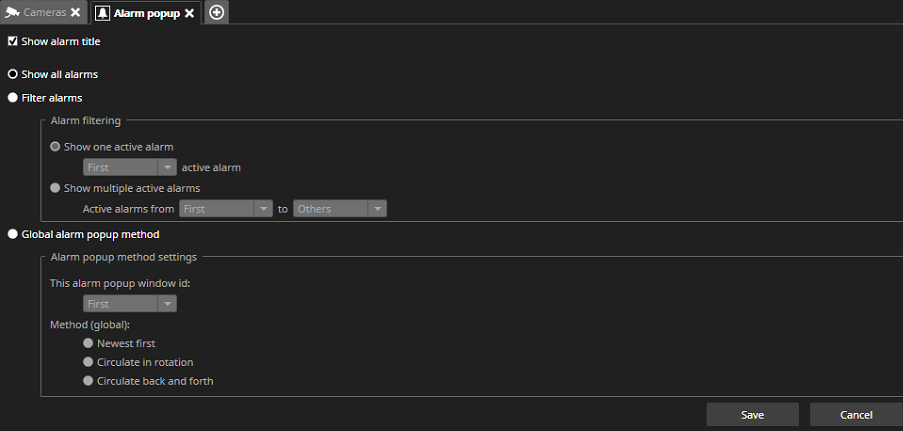 The alarm name can be controlled from both Spotter settings (system default) and alarm popup-specific settings. When the user is "administrator" or has System Manager rights in the user group, he can see the Alarm Popup setting view.