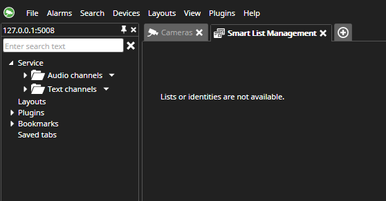 If a list management service is available and contains identity lists and you have permission to access them, you will see the main plugin view dialog below: