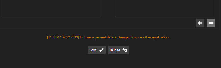 If the plugin receives a notification that list management data was changed by another user/application, then all data will be reloaded automatically, and you will receive the message below:
