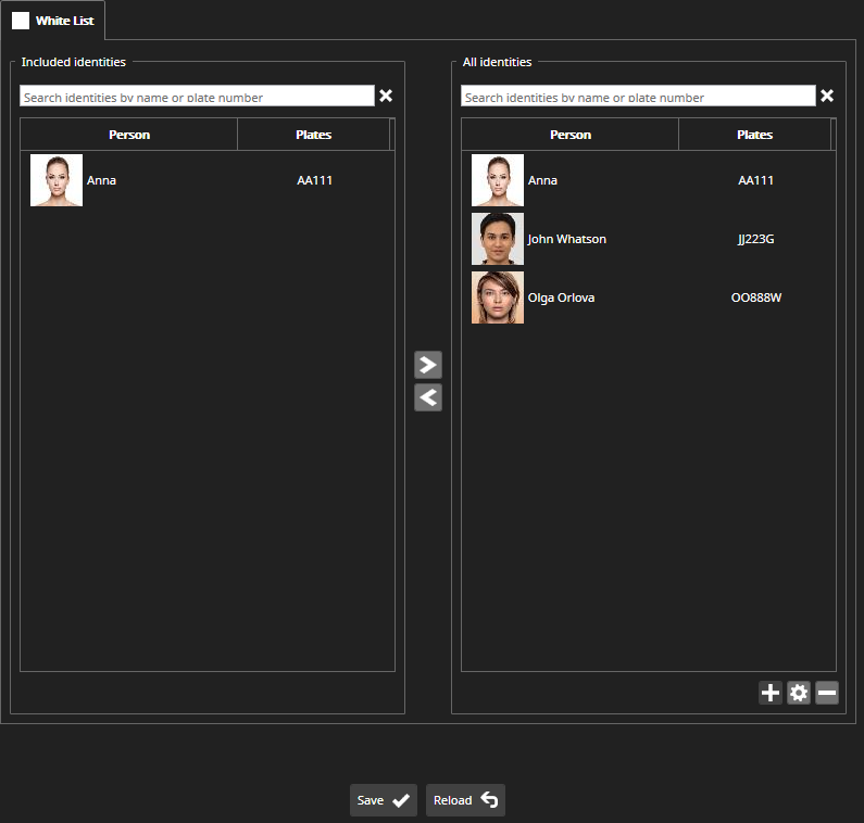 Above the lists of identities, you can find the Search fields: when you type text in the search field, the list of identities is automatically filtered if the text is found in identity names or plates.