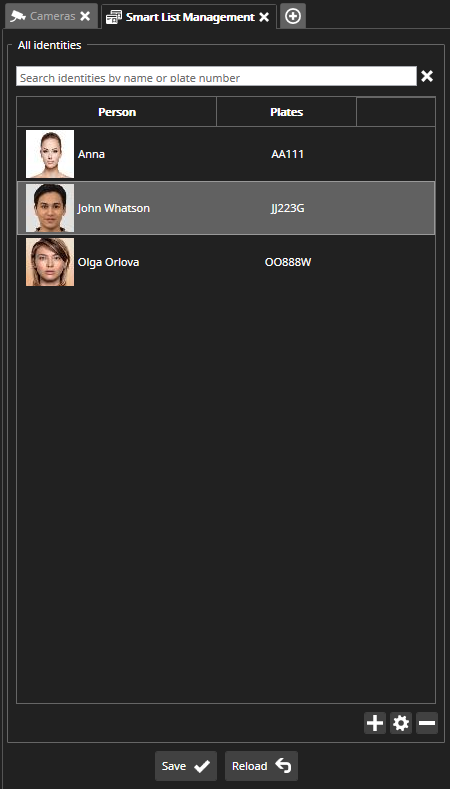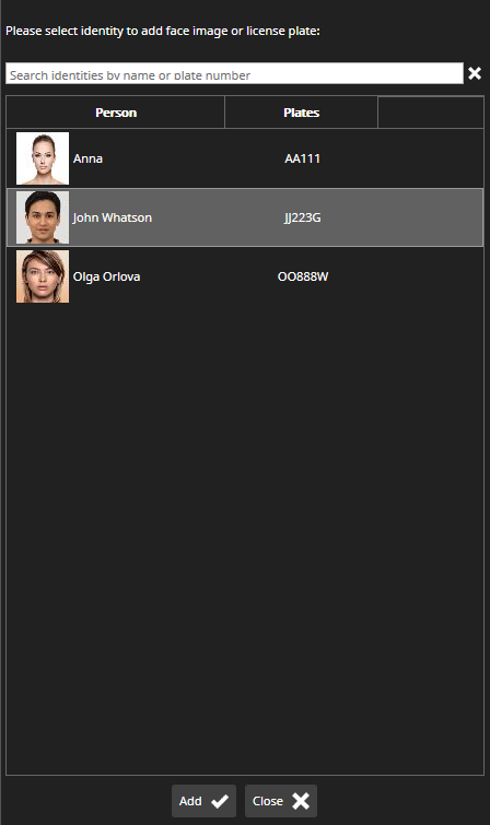 By clicking the Add face image or plate number to an existing identity button, the Smart List Management plugin will be opened, and in the Identity Selection view and you can select which identity should be updated: