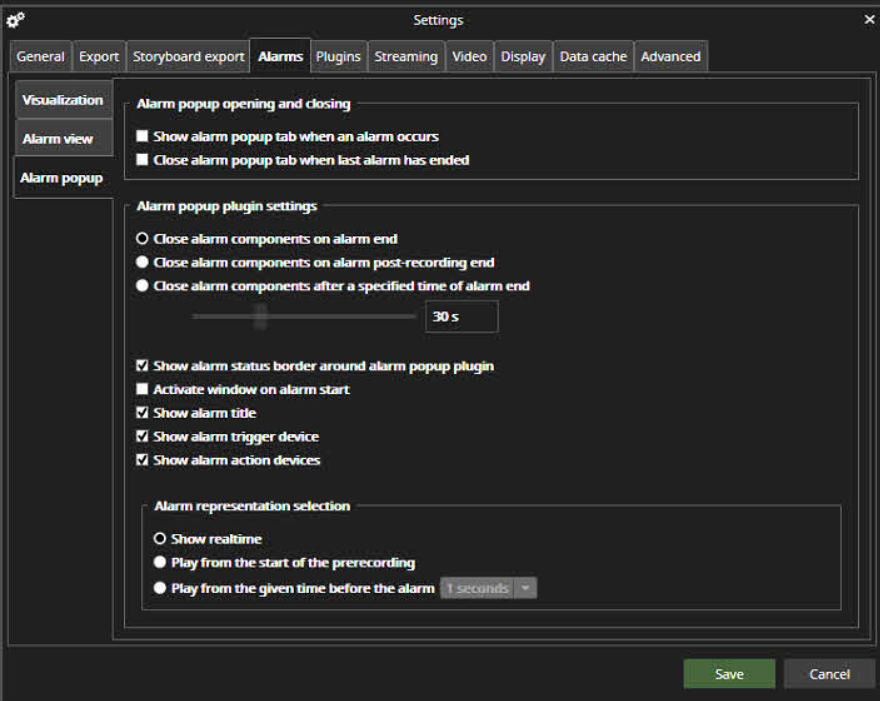 Alarm popup settings define how the Alarm popup view opens and closes.