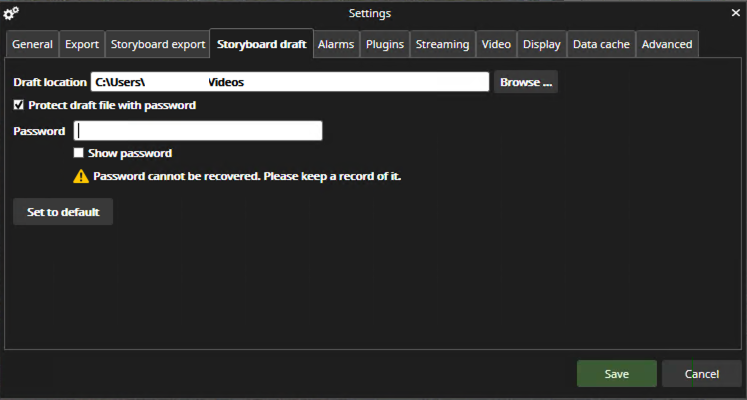 Define the folder where Storyboard drafts and their versions will be saved in Storyboard draft settings.