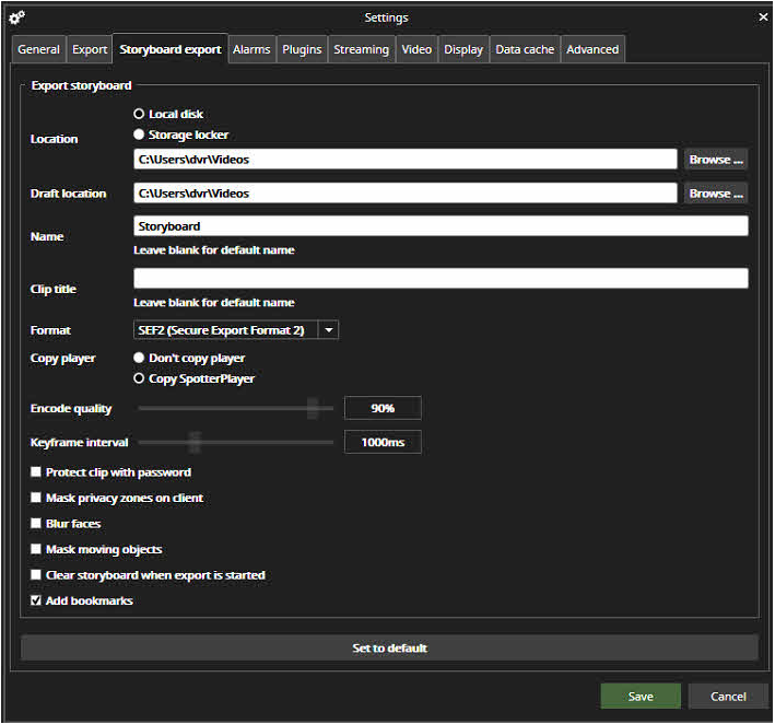 Storyboard settings contain the export target location and the target location for the draft storyboards.
