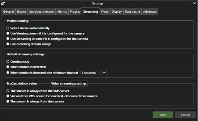 TruCast default value: Whether the live view stream is directly from the camera (TruCast) or the VMS Server.