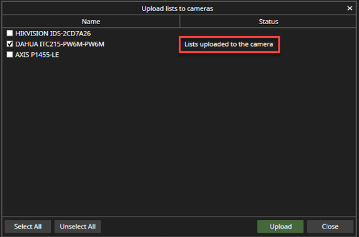 Select cameras, where lists are uploaded